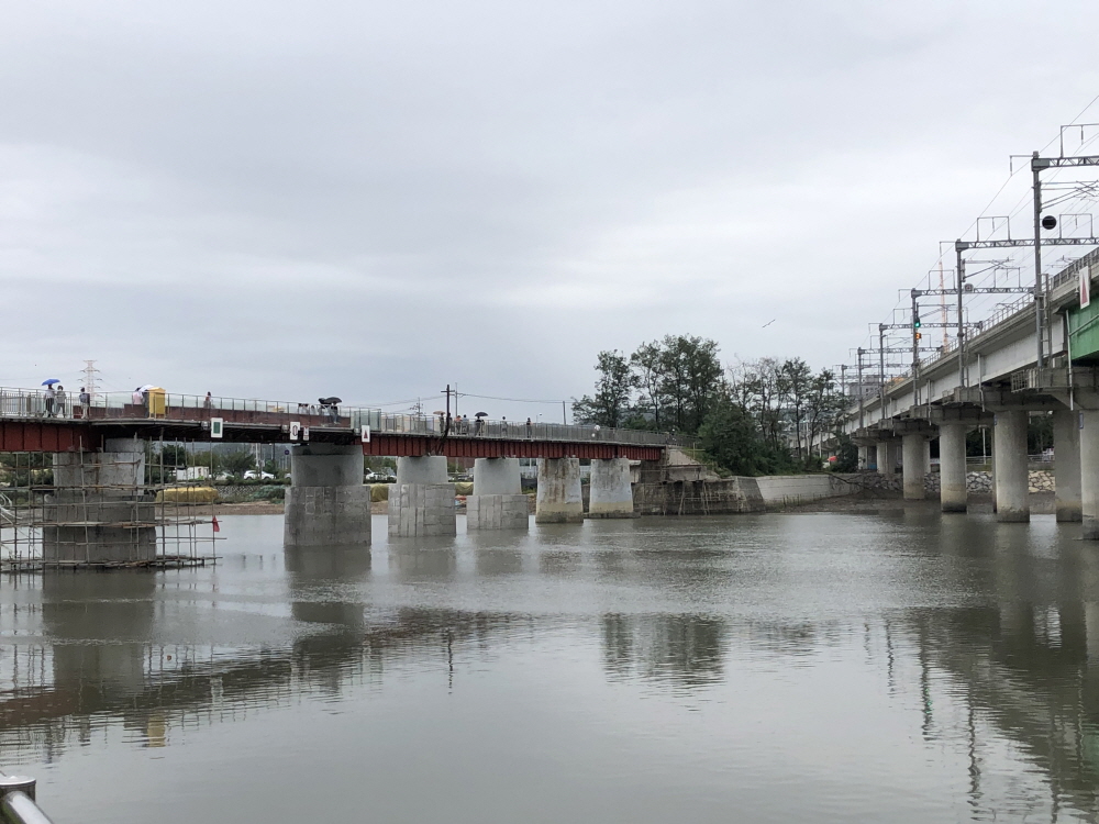 오른쪽에는 전철이 다니는 표준궤 전철 다리